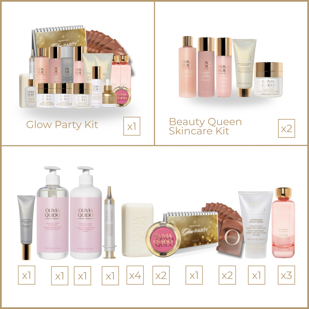 Our Beauty Queen Skincare Kit includes Olivia’s Essential Cleanser, Toner, and Moisturizer, perfect for washing off make-up and resetting skin before and after an event.
